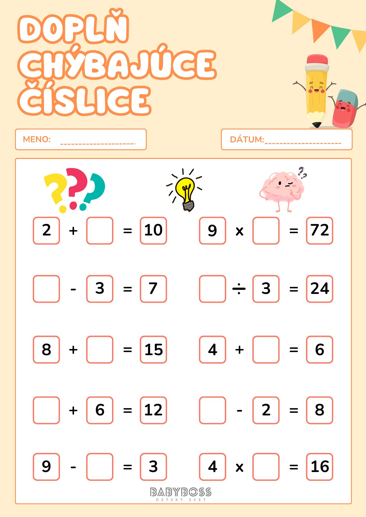 Poďte s nami objaviť, že svet čísel môže byť úžasným dobrodružstvom plným zábavy! Naše matematické úlohy sú navrhnuté tak, aby hravou a nenásilnou formou zoznámili vaše dieťatko so základmi počítania. Keď váš malý objaviteľ počíta obrázky, spája bodky podľa čísel alebo rieši svoje prvé jednoduché príklady, buduje si nielen pevné základy pre matematiku, ale zároveň si trénuje sústredenie, pamäť a trpezlivosť. Každý správne vyriešený príklad prináša obrovskú radosť a posilňuje sebavedomie s pocitom „Ja to viem!“. V našej zbierke nájdete úlohy pre rôzne vekové kategórie, od prvého spoznávania čísel pre najmenších až po jednoduché sčítanie a odčítanie pre šikovných predškolákov. Tak smelo do toho, vyberte si úlohu, ktorá vás zaujme, a sledujte, ako sa z vášho dieťatka stáva malý, sebavedomý matematik!