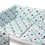 Materiál: Obliečky – 100% bavlna. Mantinel: Vrchná časť 100% bavlna, výplň duté vlákno – hypoalergénne.