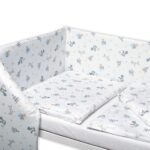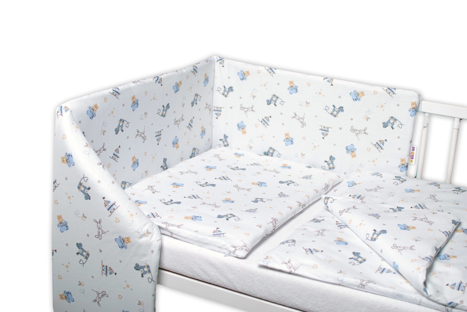 Materiál: Obliečky – 100% bavlna. Mantinel: Vrchná časť 100% bavlna, výplň duté vlákno – hypoalergénne.