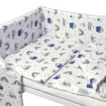 Materiál: Obliečky – 100% bavlna. Mantinel: Vrchná časť 100% bavlna, výplň duté vlákno – hypoalergénne.