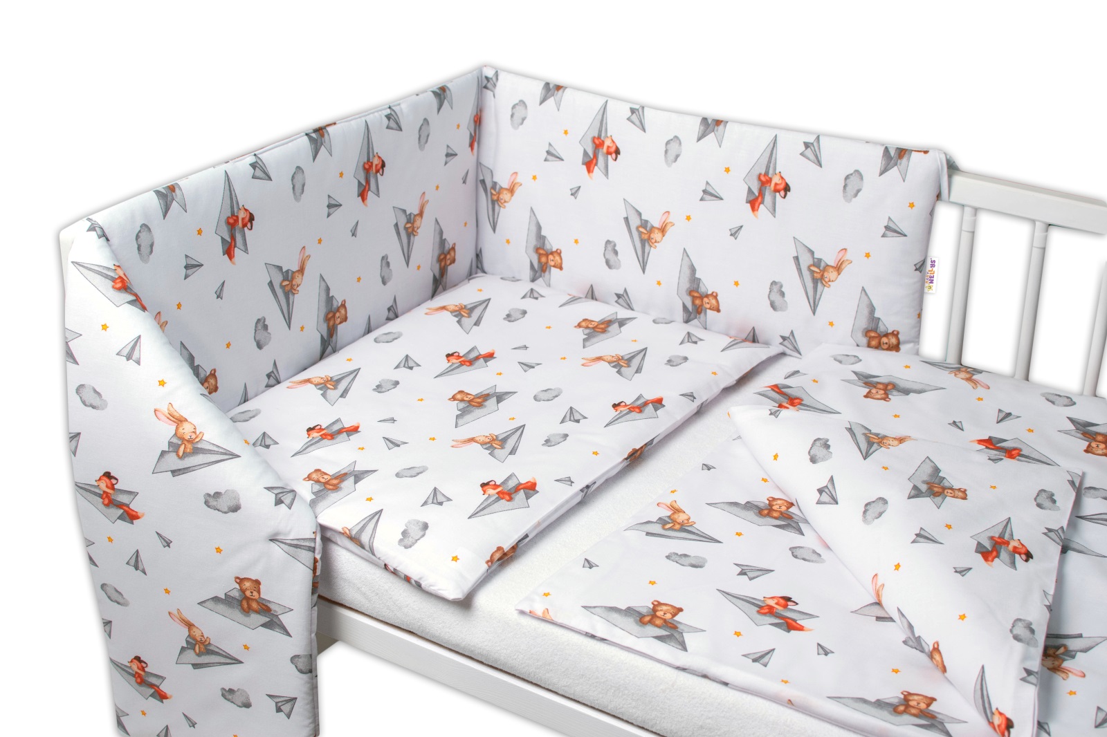 Materiál: Obliečky – 100% bavlna. Mantinel: Vrchná časť 100% bavlna, výplň duté vlákno – hypoalergénne.