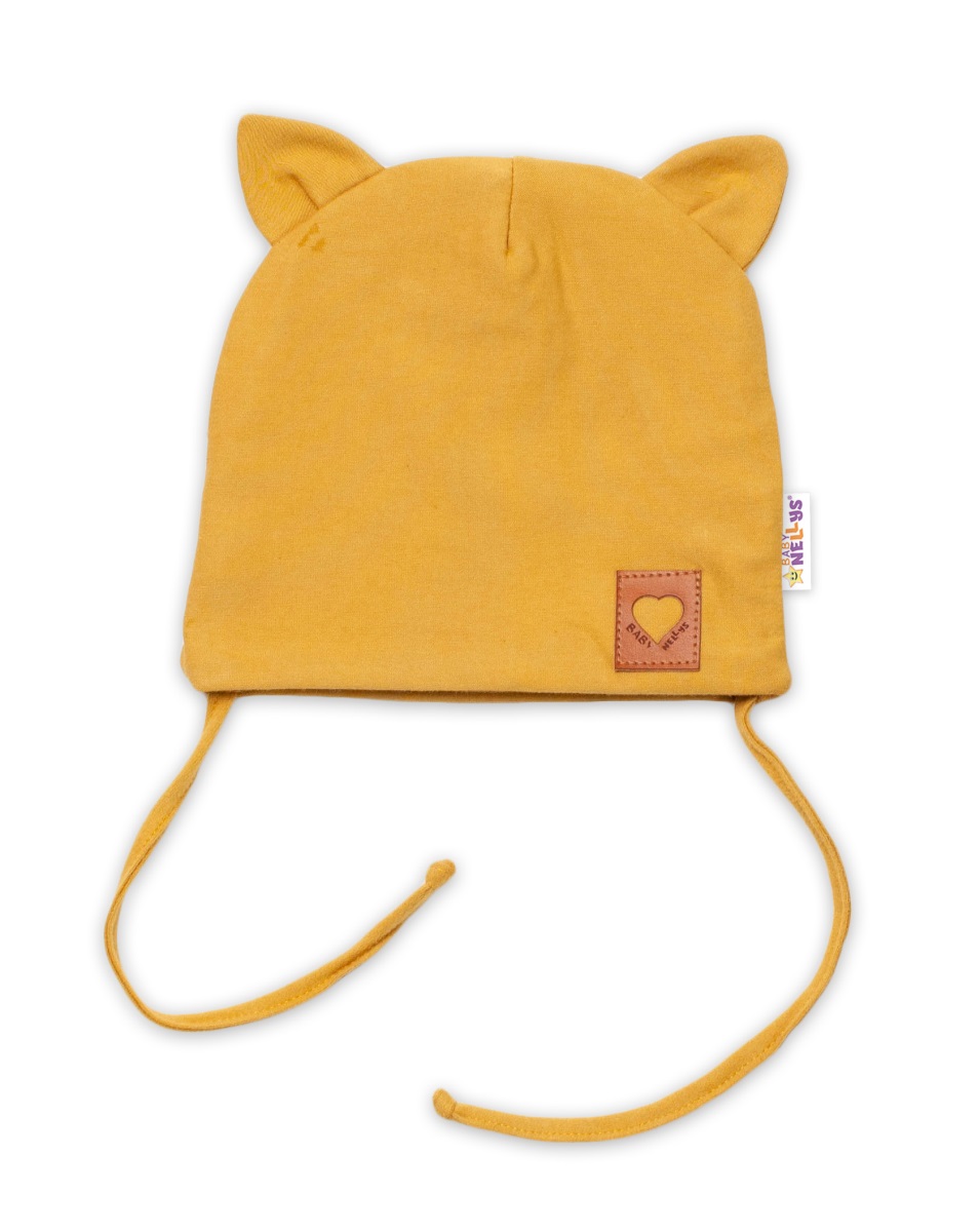 Baby Nellys Bavlnená dvojvrstvová čiapka s uškami na zaväzovanie, FOX – horčicová