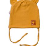 Baby Nellys Bavlnená dvojvrstvová čiapka s uškami na zaväzovanie, TEDDY – horčicová