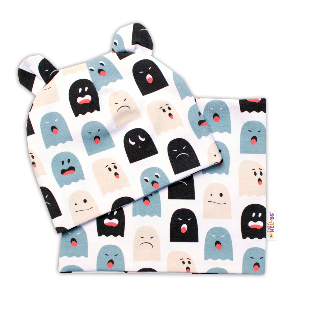 Baby Nellys Dvojvrstvová čiapka s uškami + komínček Príšerky, biela/mátová