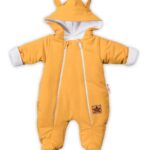 Baby Nellys ® Kombinézka s dvojitým zapínaním, s kapucňou a uškami – horčicová, veľ. 62