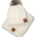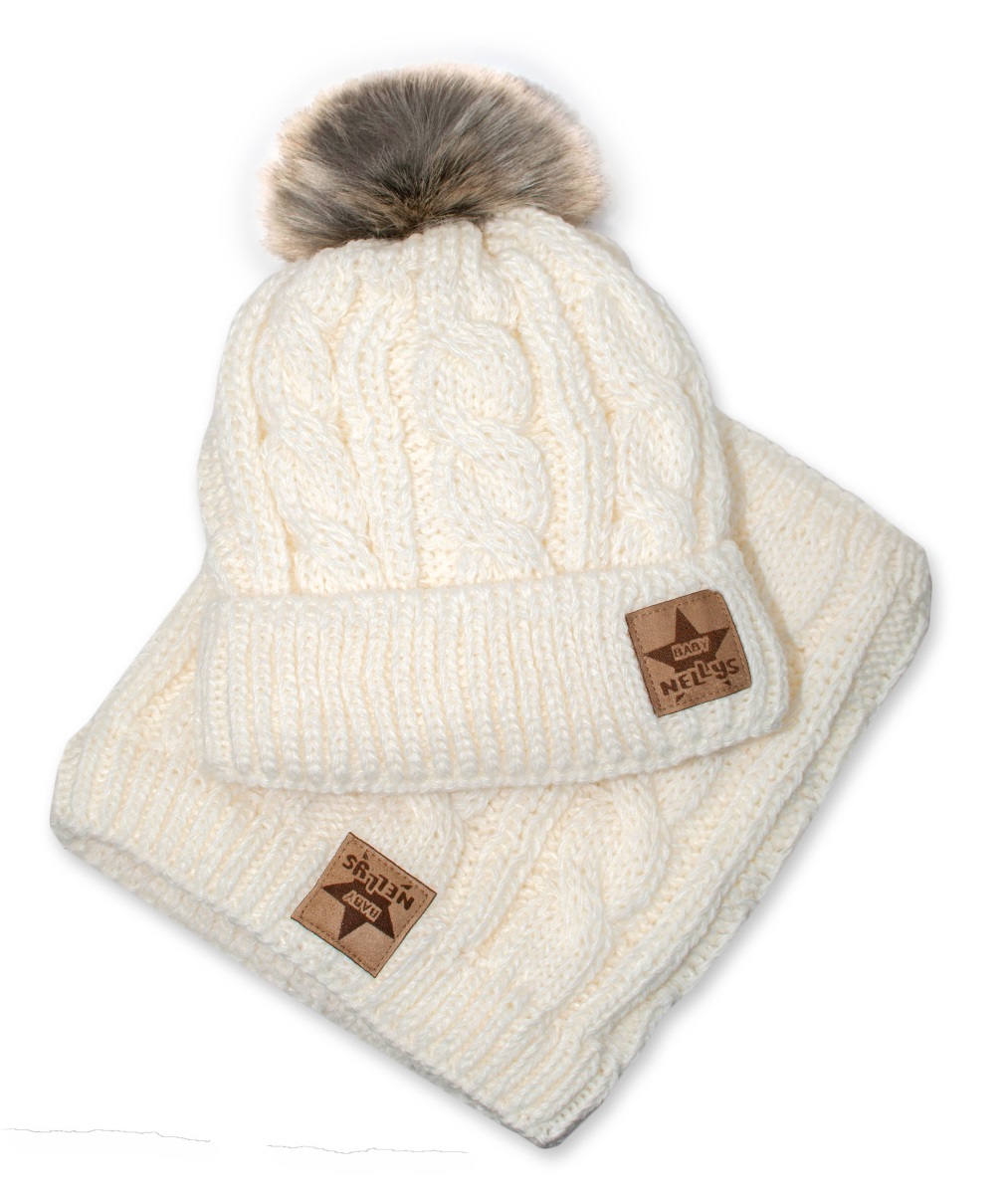 BABY NELLYS Zimná pletená čiapka s brmbolcom + komín, smotanová