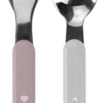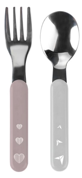Nerezová lyžička a vidlička so zaoblenými koncami a plastovou rukoväťou s obrázkami.