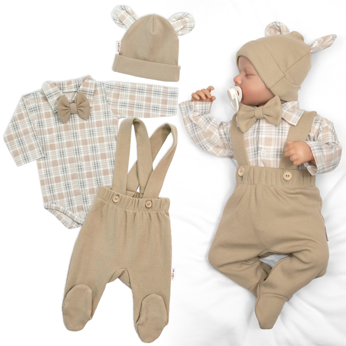 Bavlnená súprava Gentleman 3D, body, polodupačky s lacnom, čiapočka, béžová/kocka, 68