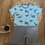 Body s nohavičkami Mamatti, Dino park – modrá s potlačou/sivá
