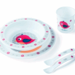 Set obsahuje misku (270 ml), tanierik, hrnček (170 ml) a príbor.