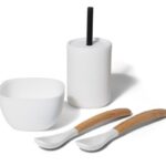 Táto krásna sada kombinujúca bambusový a silikónový riad vám poskytne potrebné prvky riadu pre vaše dieťa. Súprava obsahuje mini silikónovú misku, ideálna na prvé príkrmy bábätka, silikónový kelímok, ktorý dieťaťu uľahčí prechod z fľaše na hrnčeky, 2 bambusové lyžičky so silikónovou špičkou pre uľahčenie učenia sa samostatne jesť.