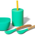 Táto krásna sada kombinujúca bambusový a silikónový riad vám poskytne potrebné prvky riadu pre vaše dieťa. Súprava obsahuje mini silikónovú misku, ideálna na prvé príkrmy bábätka, silikónový kelímok, ktorý dieťaťu uľahčí prechod z fľaše na hrnčeky, 2 bambusové lyžičky so silikónovou špičkou pre uľahčenie učenia sa samostatne jesť.