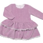Detské šaty z ružového velúru. Šaty boli ušité zo zamatu na dotyk velúru zloženého z 80% bavlny a 20% polyesteru. Odev je mimoriadne príjemný na dotyk. Majú dva prestrihy, spodná časť šiat je zakončená jemnou čipkou. Odev sa odopína na krku, má antialergické patentky bez obsahu niklu, ktoré sú bezpečné pre citlivú pokožku dieťaťa.