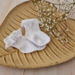 Charakteristickým znakom ponožiek je krásne krajkové riasenie, ktoré im dodáva šarm a eleganciu. Čipkový prvok je umiestnený na vrchnej časti ponožky a jemne zdobí a zdôrazňuje jej vzhľad. Ponožky sú ideálne na nosenie pri zvláštnych príležitostiach, ako sú krstiny, narodeniny alebo sviatky.