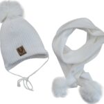 Dvojvrstvová pletená čiapočka na zaväzovanie + šál s brmbolcami, biela