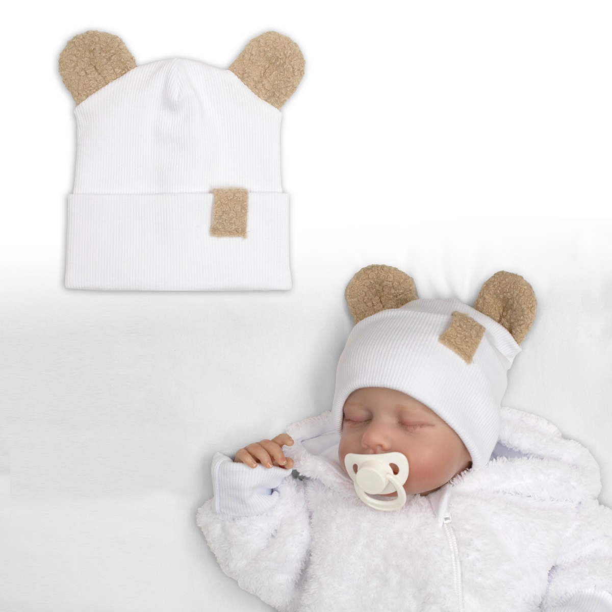 Dvojvrstvová rebrovaná čiapočka s uškami boucle medvedík – biela, 68/74