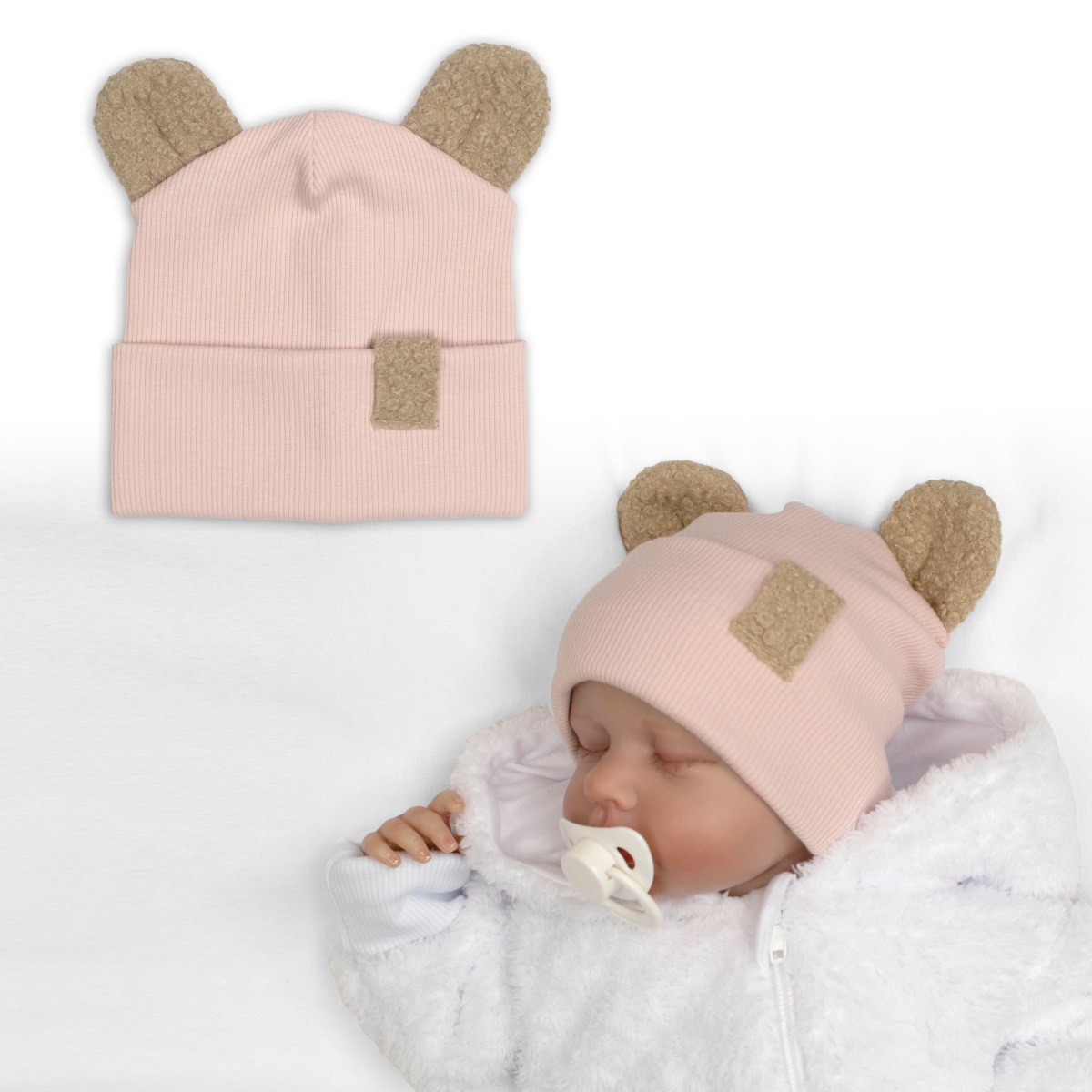 Dvojvrstvová rebrovaná čiapočka s uškami boucle medvedík – ružová