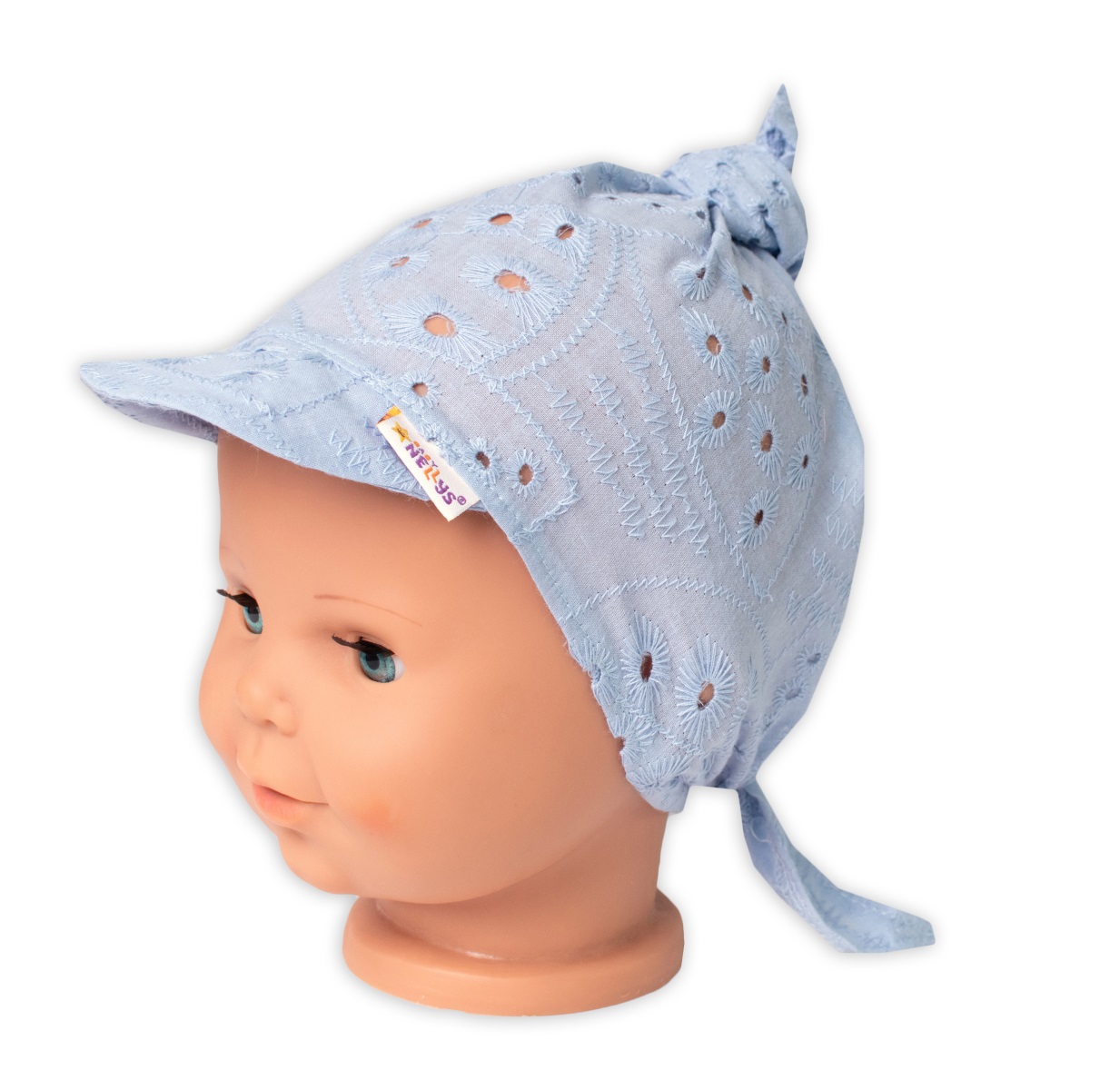 Letná šatka so šiltom, bavlna, Madeira, Baby Nellys – jeans, veľ. 9/36 m