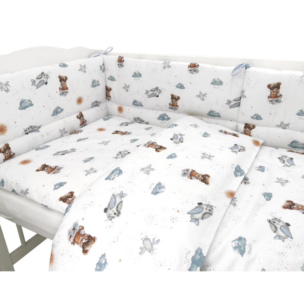 Mantinel s obliečkami do postieľky, 3D sada Bavlna, Méďa pilot – biela, modrá, 135×100