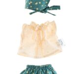 Očarujúce set v smotanovej a zelenej farbe. Top je vyrobený zo vzdušnej a jemnej bavlnenej látky plumaťu v teplom béžovom odtieni. Vpredu je mierne nariasenie pre ľahšie obliekanie bábiky. Dokonale ladiace nariasené kvety v odtieni morskej zelenej s potlačenými béžovými bodkami a jemnými kvetmi. Zelený klobúk s kravatou dodáva celému setu kúzlo. Látka, z ktorej sú kraťasy a čiapky vyrobené, môže byť vďaka potlači trochu tuhá, ale po prvom vypraní zmäkne.