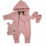 Oteplený detský overal bez šľapiek s kapucňou, čiapočka + topánočky, 3D, koralova, veľ. 80