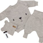 Pletená dojčenská sada 3D Medvedík, svetrík, tepláčiky + čiapočka Kazum, béžová, veľ. 80