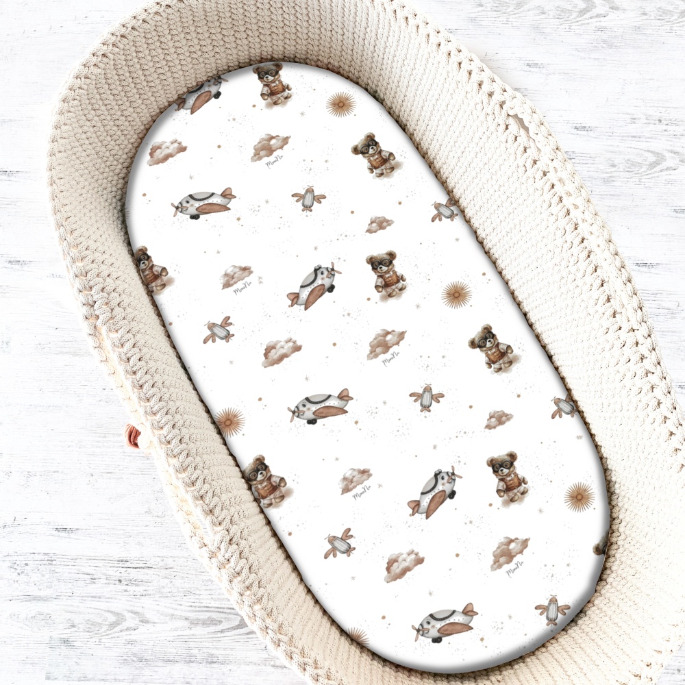 Prestieradlo do kočíka, koša, bavlna, Méďa pilot – biela, béžová