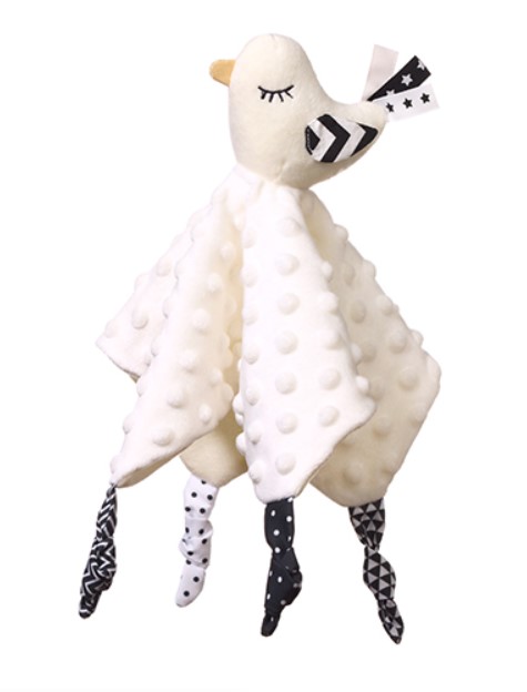 Little Birdie je funkčný produkt dva v jednom: deka a plyšová hračka. Je to aj vzdelávacia hračka. Rozvíja zmysly miminka od prvých dní života. Minky bavlnený materiál má textúru s drobnými cvočkami, ktoré stimulujú hmat. Podobne mäkké uzly alebo stuhy podporujú úchopové cvičenia. Materiál je vzdušný a jemný.