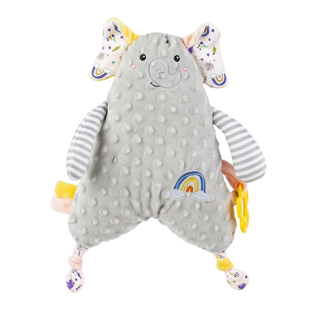 Plyšový maznáčik s hryzátkom.Sladký sloník je vysnívaným plyšákom každého malého maznáčika! Toto krásne zvieratko v pastelových farbách je vyrobené z materiálov s rôznymi vzormi a textúrami, vďaka čomu bude stimulovať zmysly bábätka, čím mu pomôže rozvíjať jeho kognitívne schopnosti. Hračka je vybavená hryzátkom s výstupkami, ktoré prinesú úľavu vášmu bábätku pri prerezávaní zúbkov. Plochý a mäkký tvar hračky nabáda na pomaznanie.