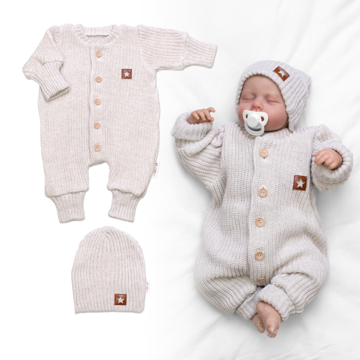 Rastúci pletený overálok + čiapočka Star, béžový melírok