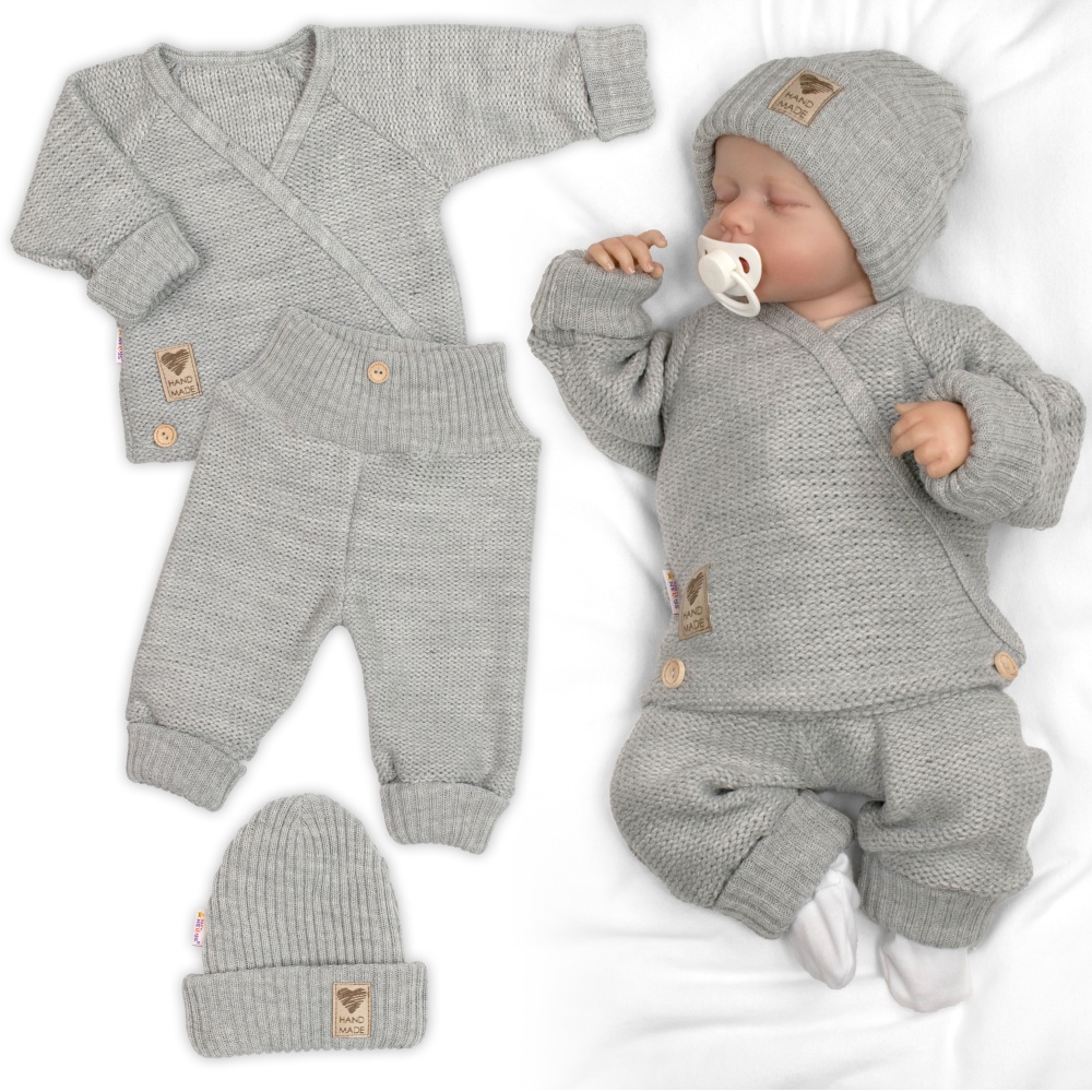 Rastúci pletený zavinovací svetrík, nohavice a čiapky, 3D – šedá, veľ. 68/74