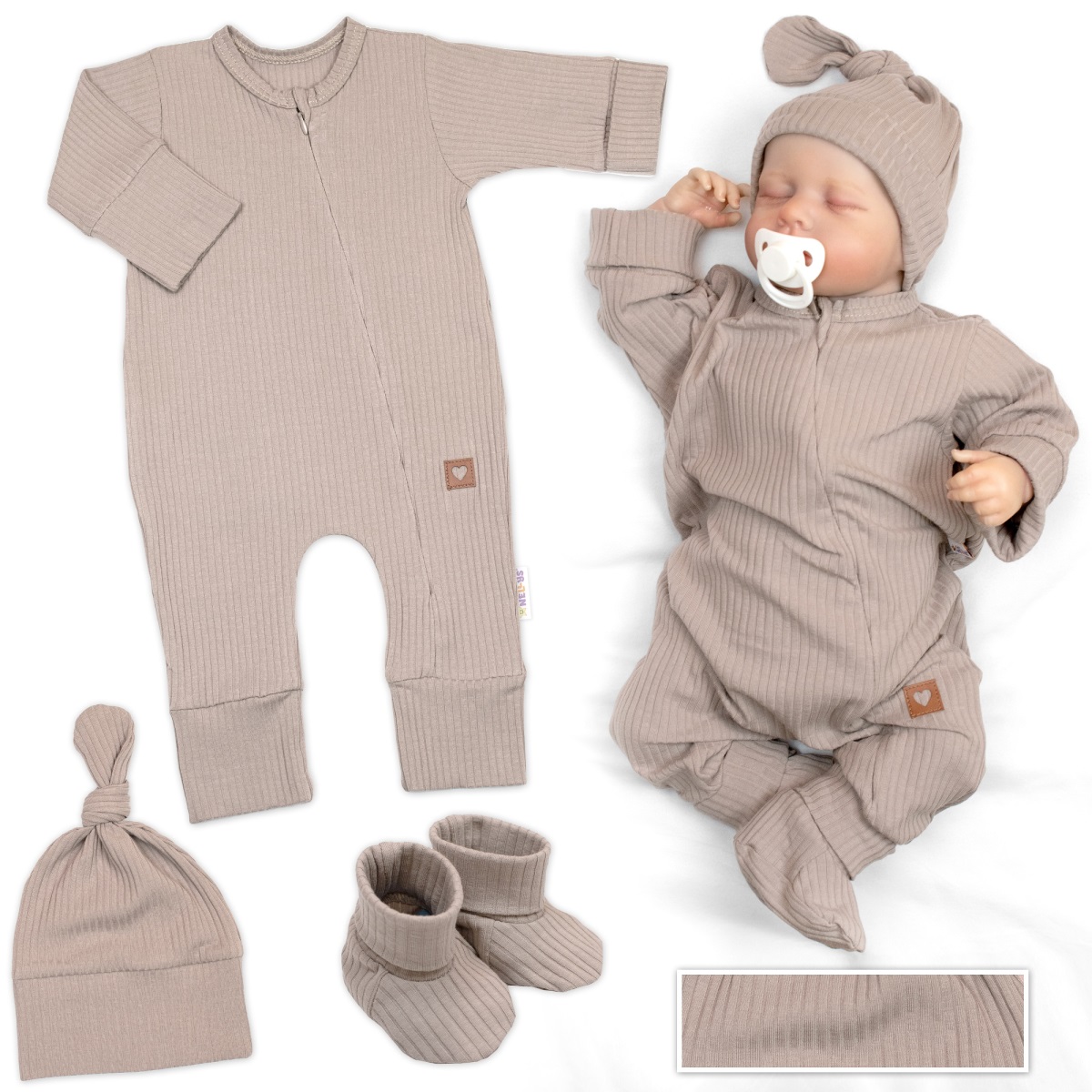 Rastúci rebrovaný overálek, čiapočka a topánočky, 3D, Nature – toffi, veľ. 74/80