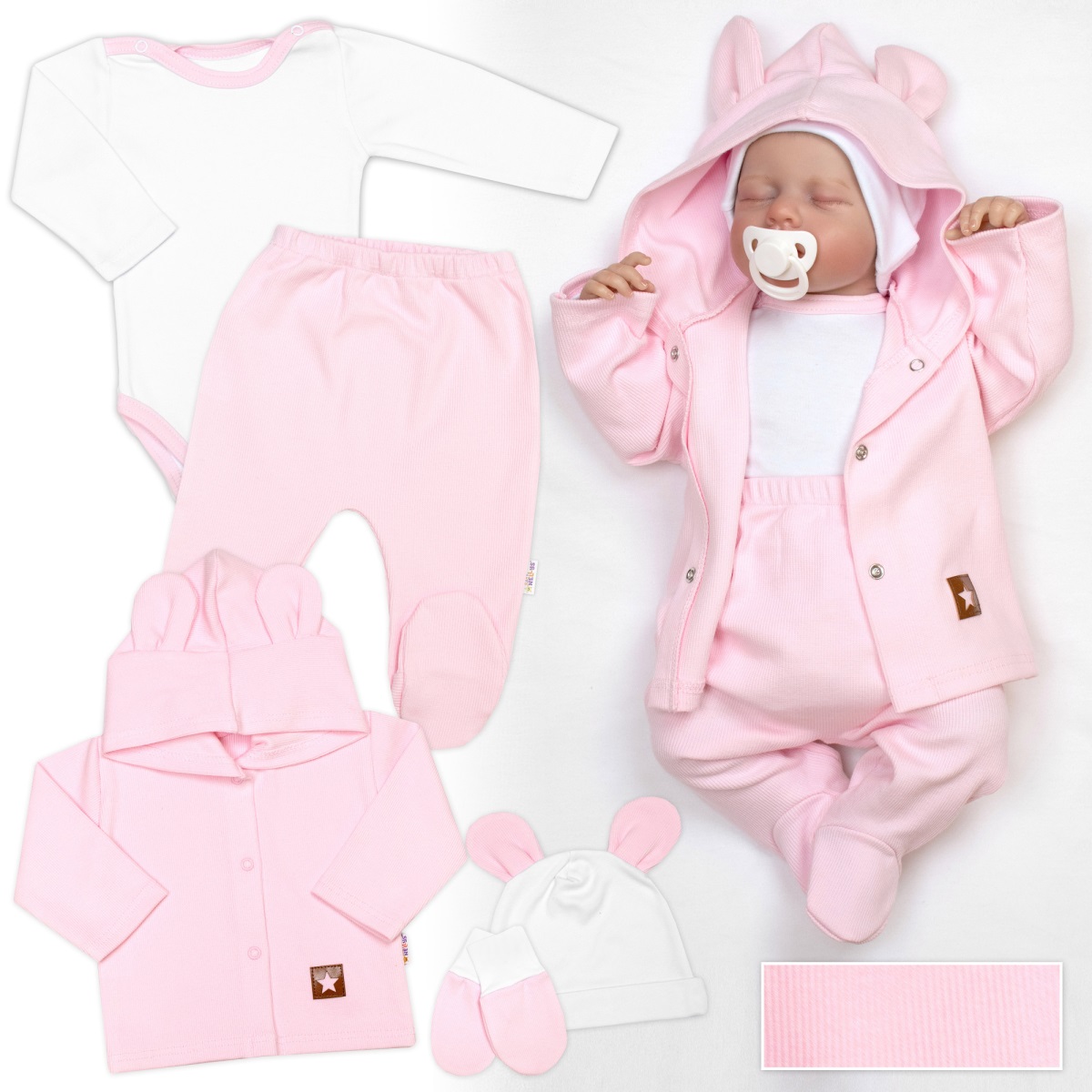 Rebrovaná sada, Star 5D, body, polodupačky, kabátik, čiapka, rukavice – rúžová, biela,68