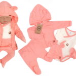 Sada do pôrodnice 5D, body, polodupačky, kabátik, čiapočka, rukavičky – marhuľa, veľ.62