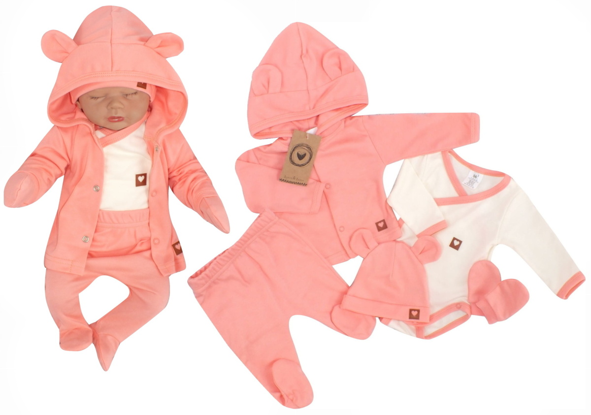 Sada do pôrodnice 5D, body, polodupačky, kabátik, čiapočka, rukavičky – marhuľa, veľ.56