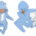 Sada do pôrodnice 5D, body, polodupačky, kabátik, čiapočka, rukavičky – modrá