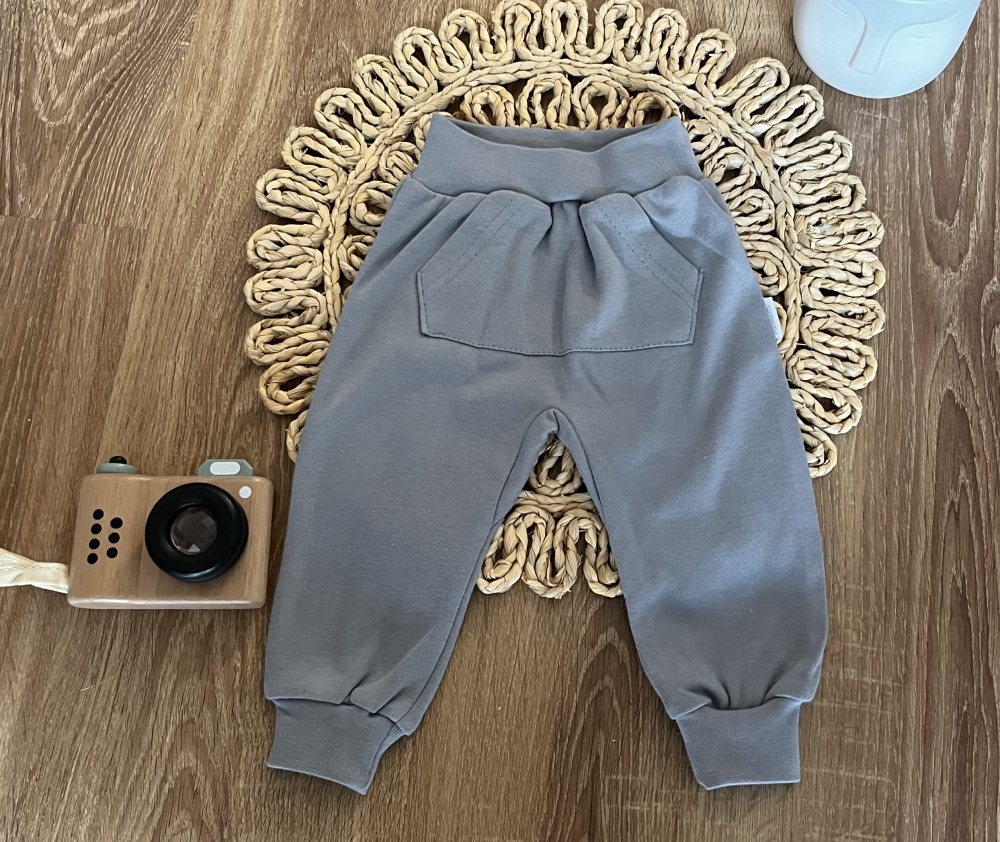 Tepláky s vreckami, bavlna Mamatti, Dino park – šedé