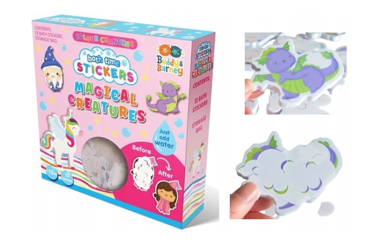 Vtipné samolepky s motívom víl, jednorožcov, drakov a ďalších bájnych bytostí od renomovaného výrobcu Buddy&Barney vykúzlia úsmev na tvári vašich najmenších aj pri tom najdôkladnejšom drhnutí! Hlavne že každá samolepka je prekvapením, pretože až po ponorení do vody sa vám stvorenie skryté na obrázku odhalí.