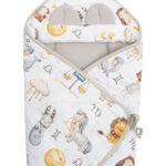 Zavinovačka 2v1 do autosedačky, kočíka, mušelín, bavlna – Hviezdne zvieratká – šedá, biela