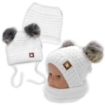 Zimná pletená čiapka Star s fleecom a chlpáčkové brmbolce + komínček 2D sada, biela