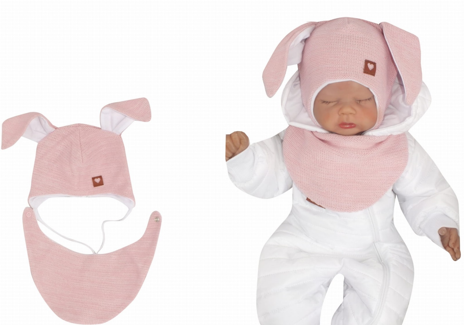 Z&Z Dvojvrstvová pletená čiapka na zaväzovanie so šatkou 2v1, Zajačik – ružová